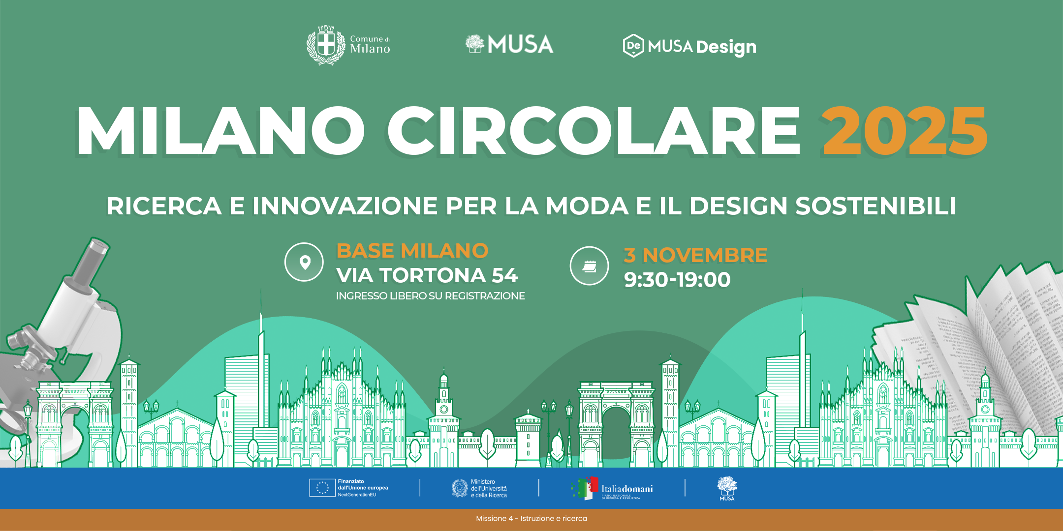 Milano Circolare 2025 - Il Comune di Milano e MUSA – Spoke 5 lanciano Milano Circolare 2025, un grande evento dedicato all’innovazione e alla ricerca per l’economia circolare il 3 novembre a BASE Milano. Sarà un momento di incontro tra operatori del settore, esperti, imprese, startup, associazioni e realtà del terzo settore, istituzioni locali, università, cittadine e cittadini per costruire insieme il futuro della moda e del design sostenibile, partendo dalla città.